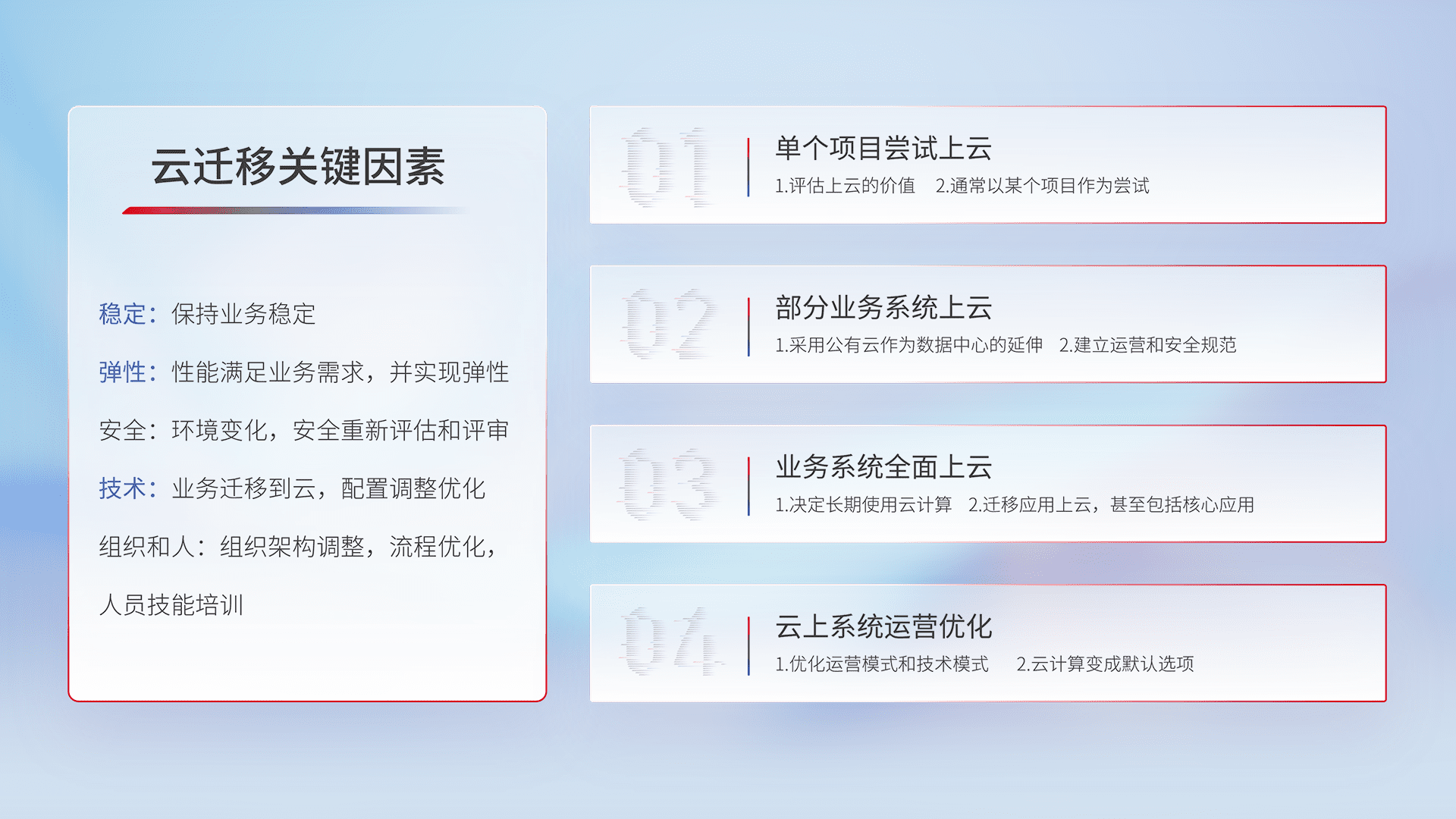结合实际业务,,从规划设计、、、、云平台选型、、、、云原生改造、、数据迁移、、、集成交付,,,,迁移全过程为客户识别最佳上云路径,,做好风险识别管理,,,设计网络架构、、、、身份权限、、、安全审计合规、、、、操作审计、、、日志审计、、、监控告警策略、、多站点容灾设计等,,,,对云上基础设施进行整体规划,,提升IT治理水平,,,,以满足弹性、、、、高可用、、、高性能的需求。。。。