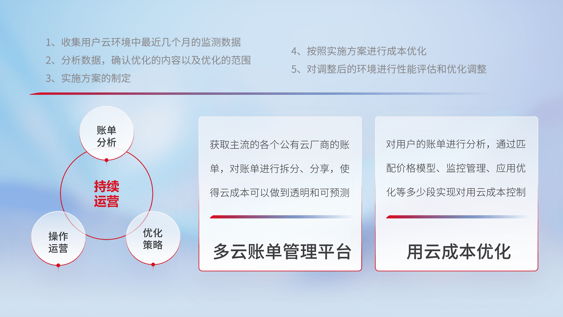 通过多云纳管,,,,以统一的资源数据模型把客户的云资源进行抽象和封装,,,进而实现对多云资源的统一操作,,保障云资源管理的可靠性、、、、稳定性与可用性。。量身定制化运维内容,,,配置、、、、开发运维、、补丁管理、、、、备份、、监控、、认证和访问管理、、、、审计和日常巡检等,,保障在用云过程中的可靠度,,,稳定度以及高可用率。。